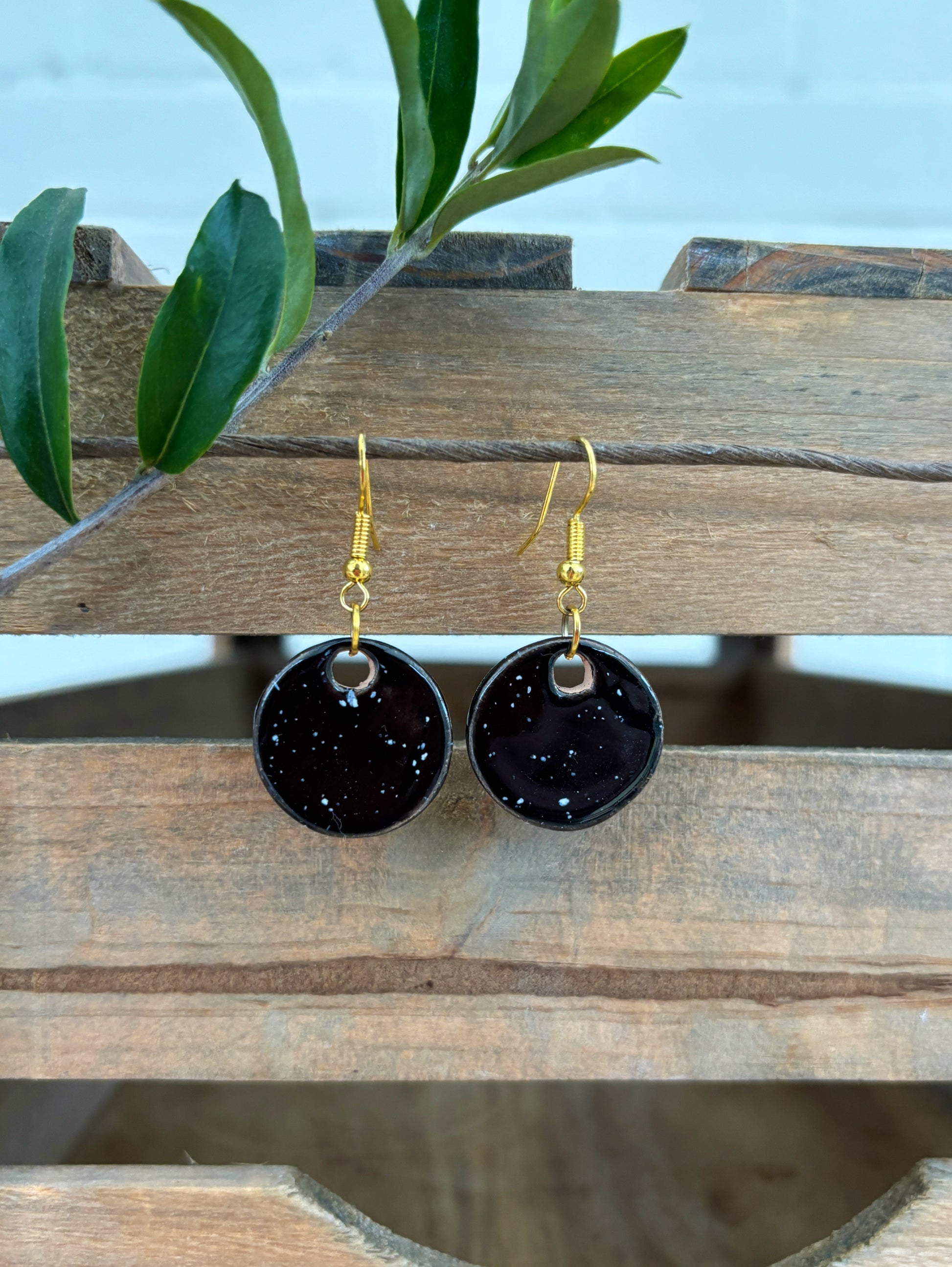 Ceramic Moon shaped earrings, size small, finished in our glossy, black & white speckled 'Orion' glaze. Available in Silver or Gold hooks or hoops.